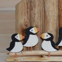 Metal Puffins Sitting On A Driftwood Groyne Ornament
