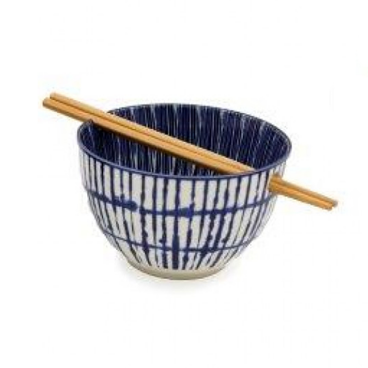 Available in 2 different designs, this ceramic blue and white print chopstick bowl comes with a set of wooden chopstick that fit neatly in the hole and indent on the rim.