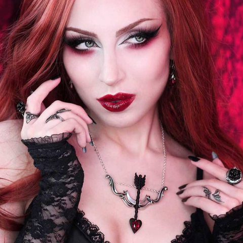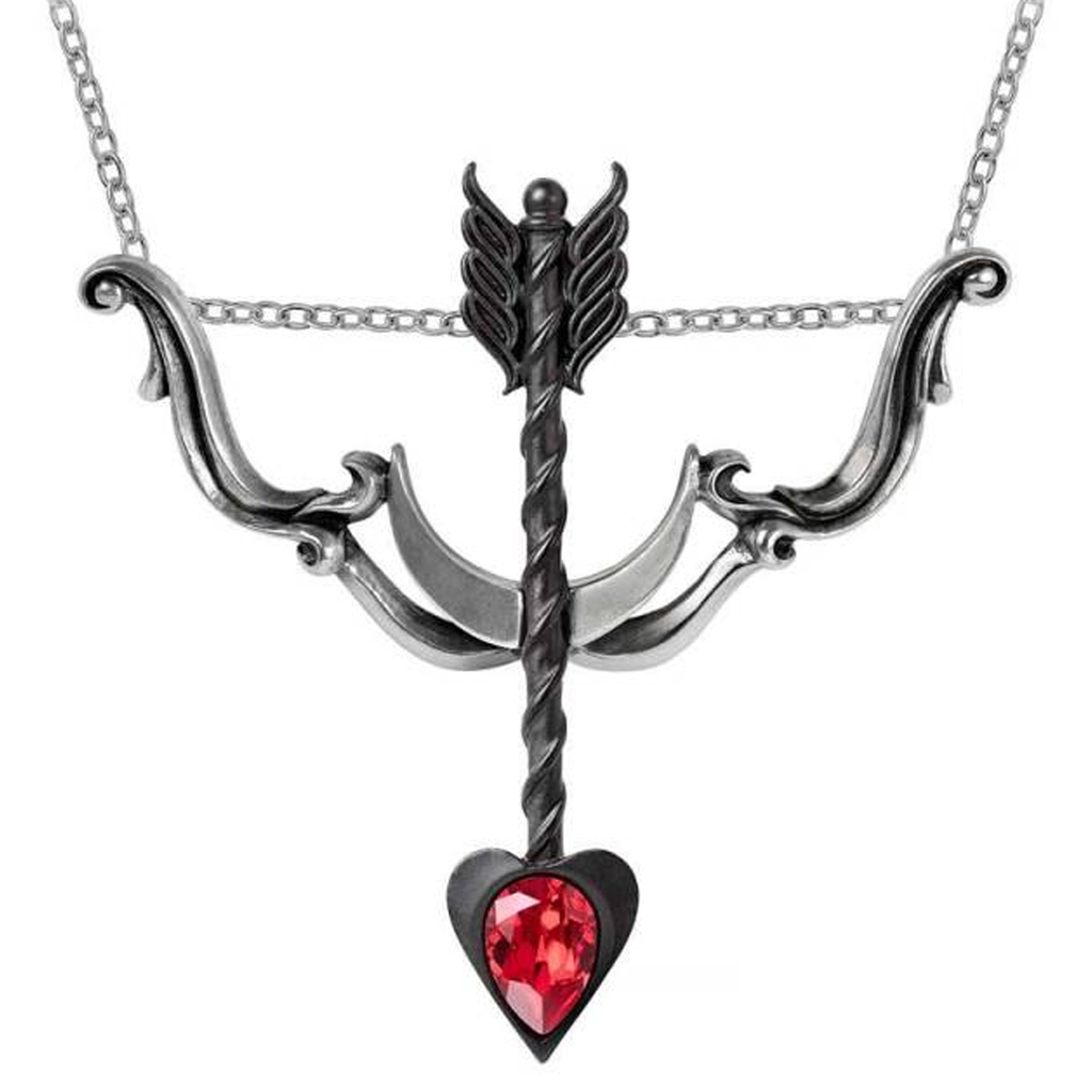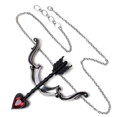 This elegant but striking gothic cupid's bow and arrow necklace is made form fine English pewter and set with an illustrious red Austrian Crystal.