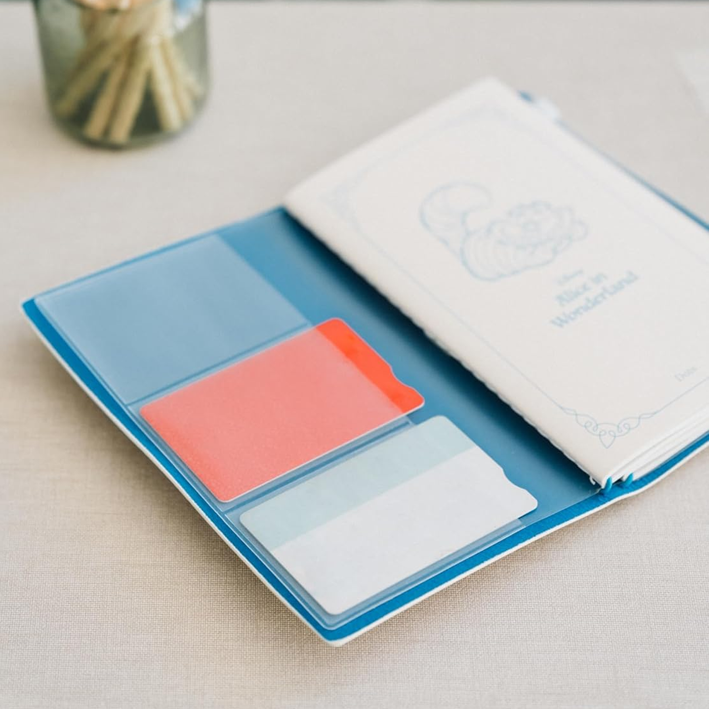 This travel notebook also includes 3 credit card or stationary slots and a plastic pocket with a zip for storing train tickets, pens, washi tape or whatever you like!
