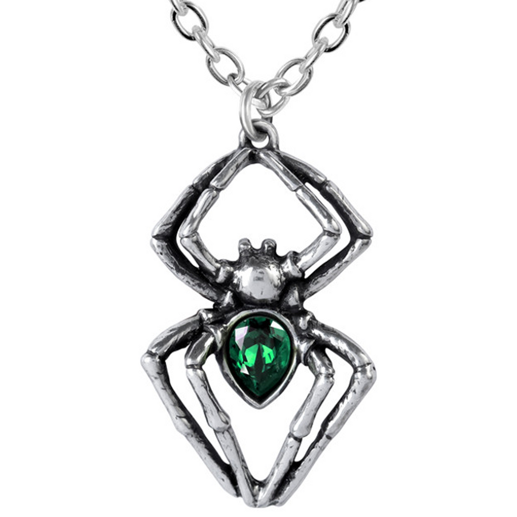 Made from fine English pewter, this 1 and a half inch arachnid shaped pendant has a venomous green Austrian crystal set in the centre.