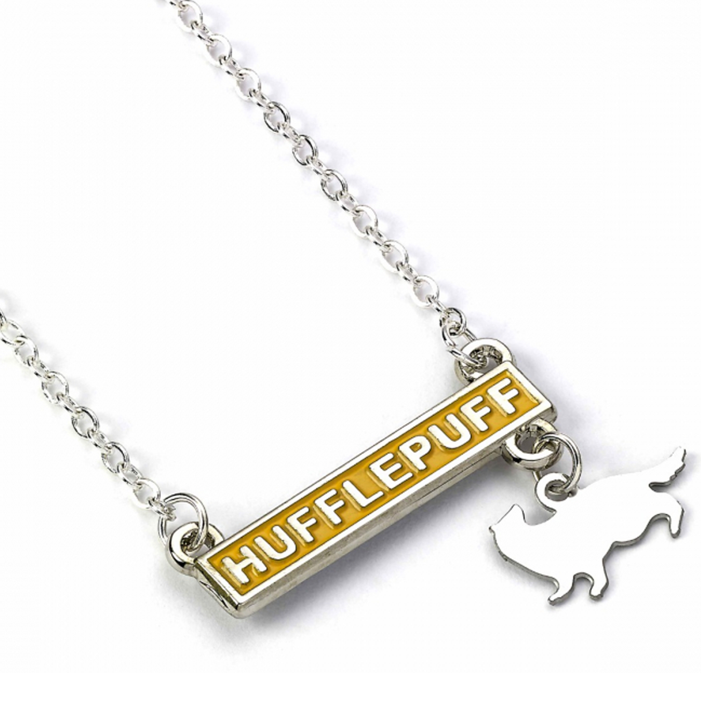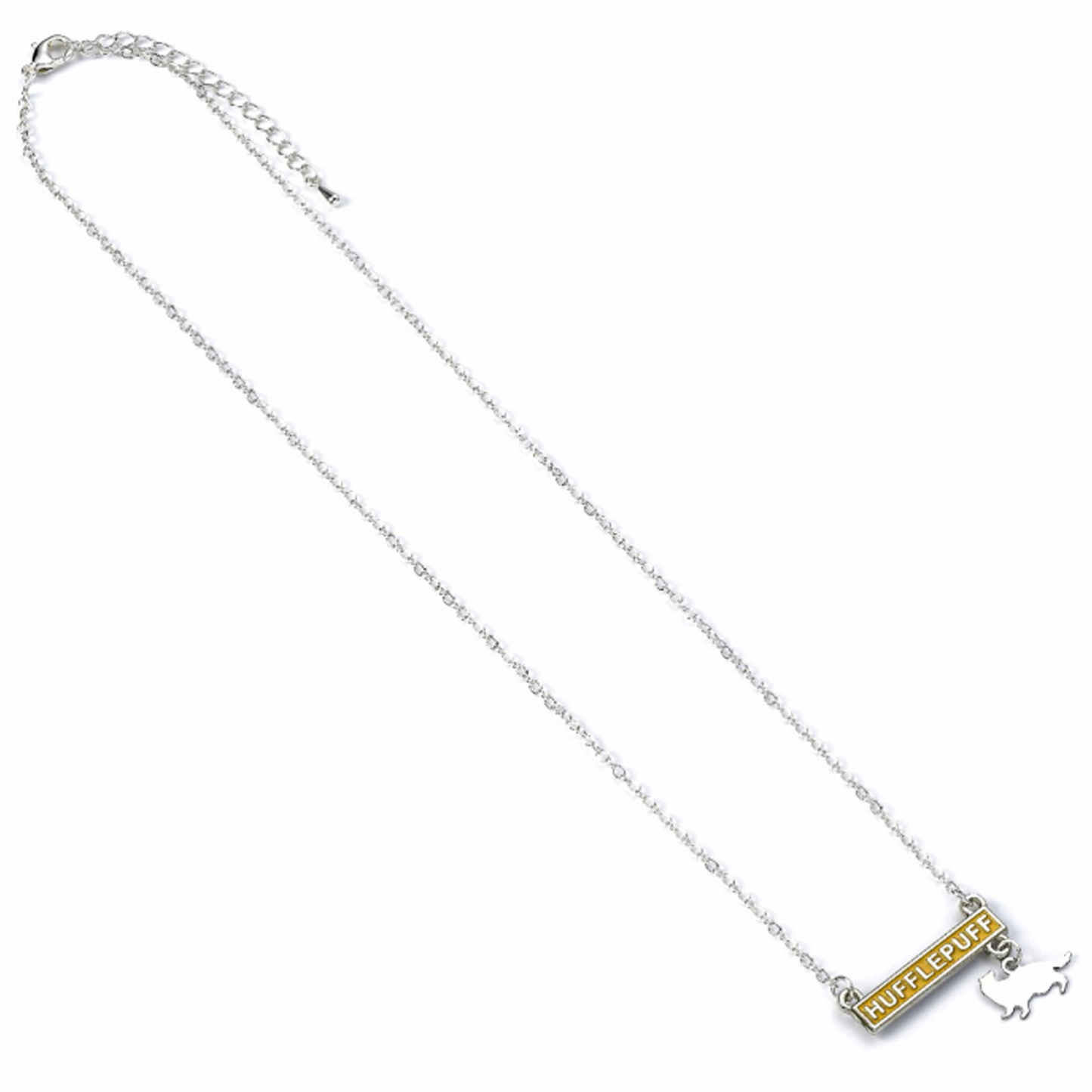 This 40cm necklace has a 5cm extender and is made from Zinc alloy with enamel detail. The Yellow enamelled bar has 'Hufflepuff' text in silver in the centre, while a badger charm hangs off the bottom corner.