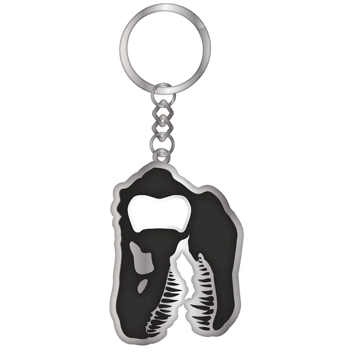 Shaped as a T-rex Skull, this black and silver enamelled metal keychain can be used to open bottle too.