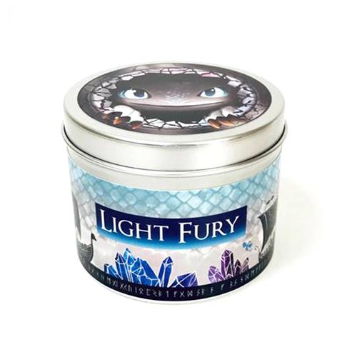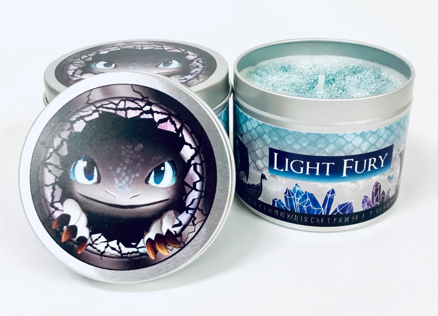 The Light Fury scented candle plumes fresh, earthy and floral scents of spearmint, white musk and water orchid from its snowy-white wax. It's top sparkles with a blue and white glitter.