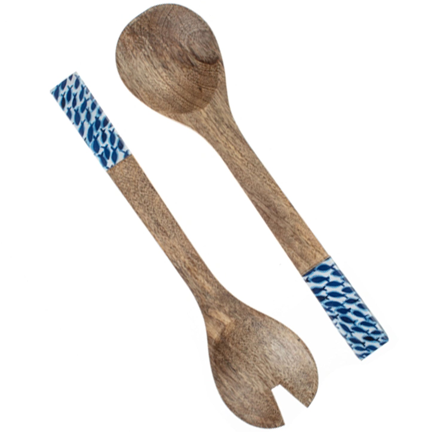 Made form mango wood and with a glazed handle design, this tong and spoon set has a fish design on each.
