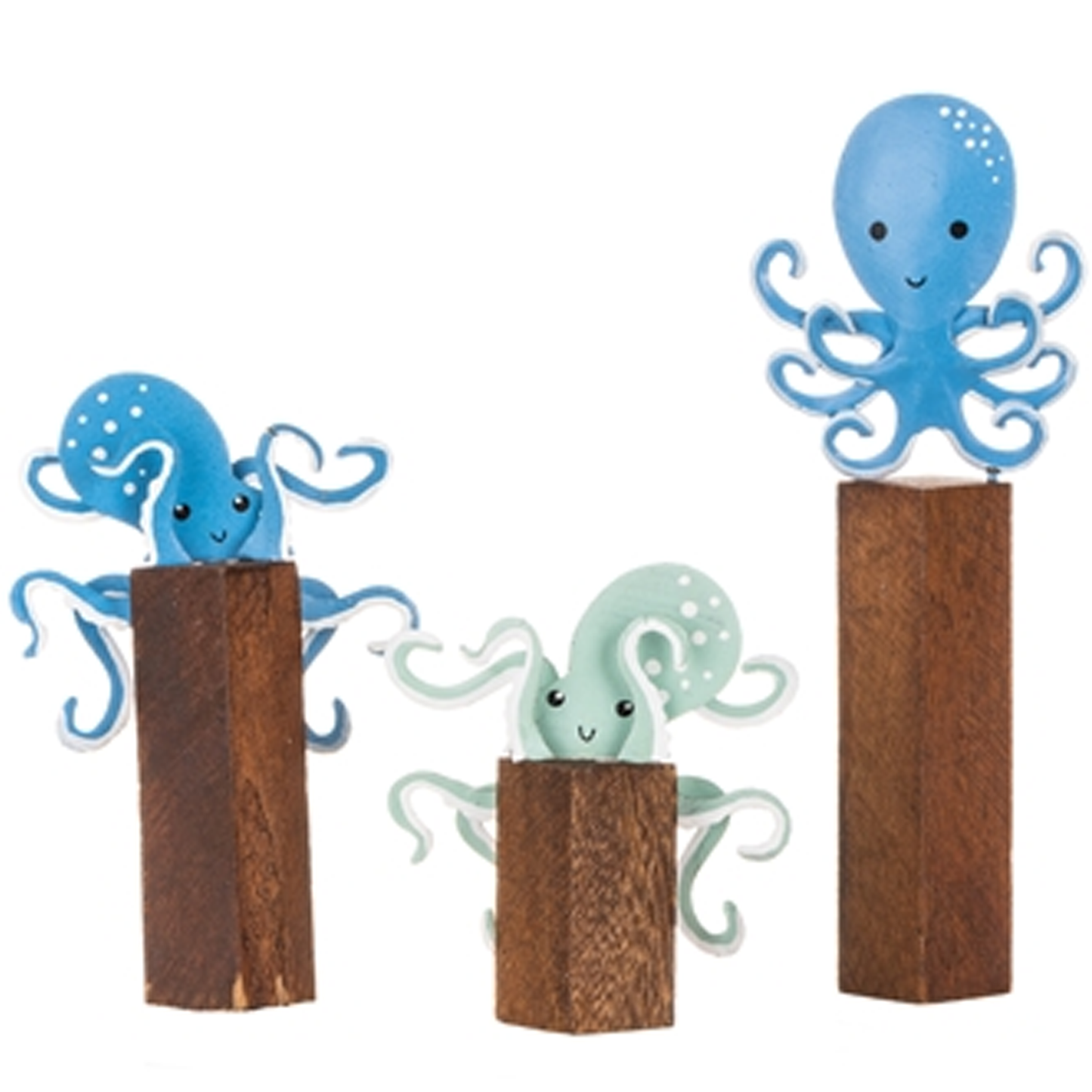 This trio of little metal octopus are playing around on wooden blocks and are here to add some fun, maritime style to your home!