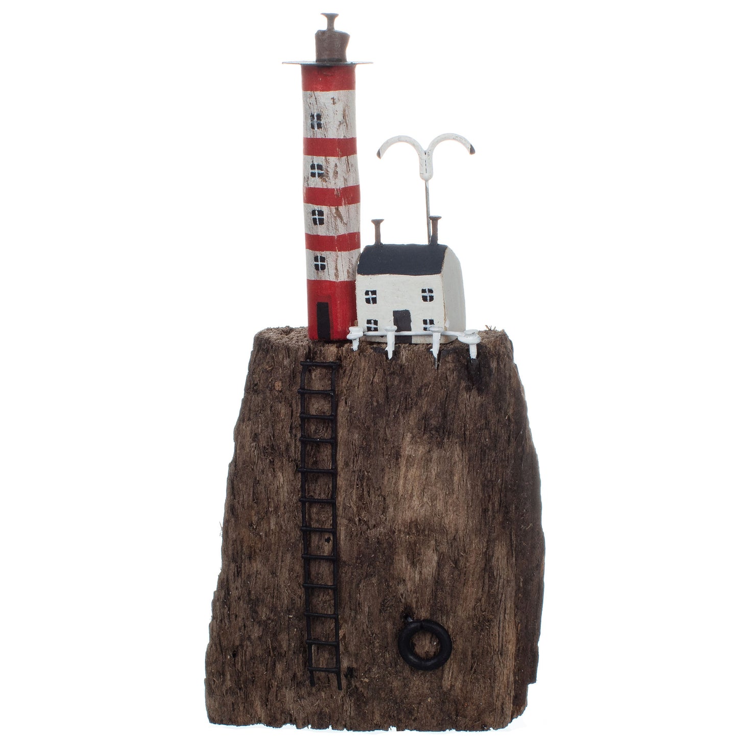 This wood and metal ornament features and classic red and white striped lighthouse beside a single white coastal cottage with a seagull flying above. There's also a little ladder down the wooden cliff face and rescue buoy for added detail.