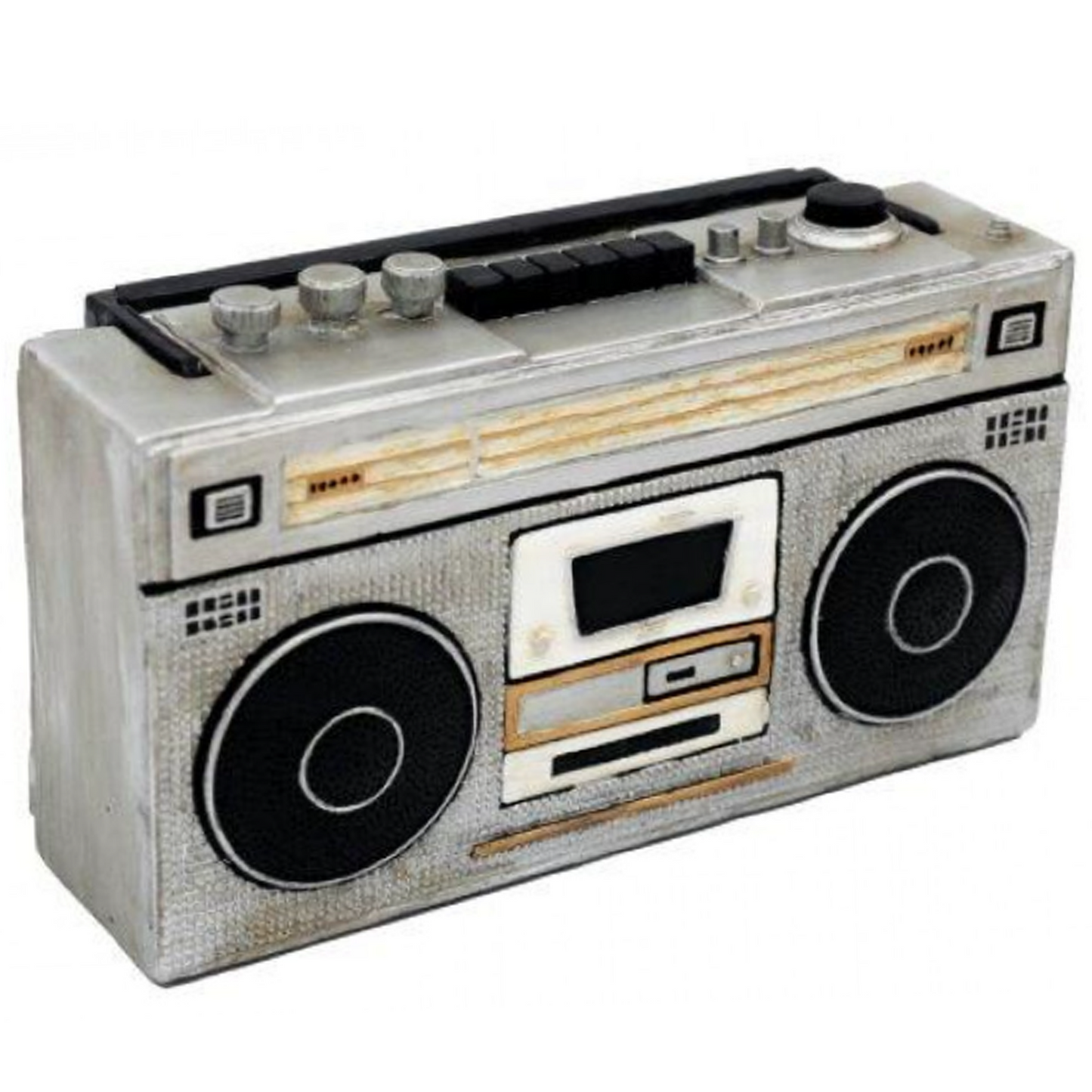 Store your money in musical style with this fun themed money bank, shaped as a retro style boom box cassette player.
