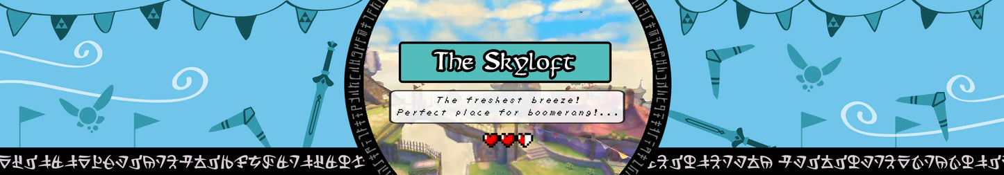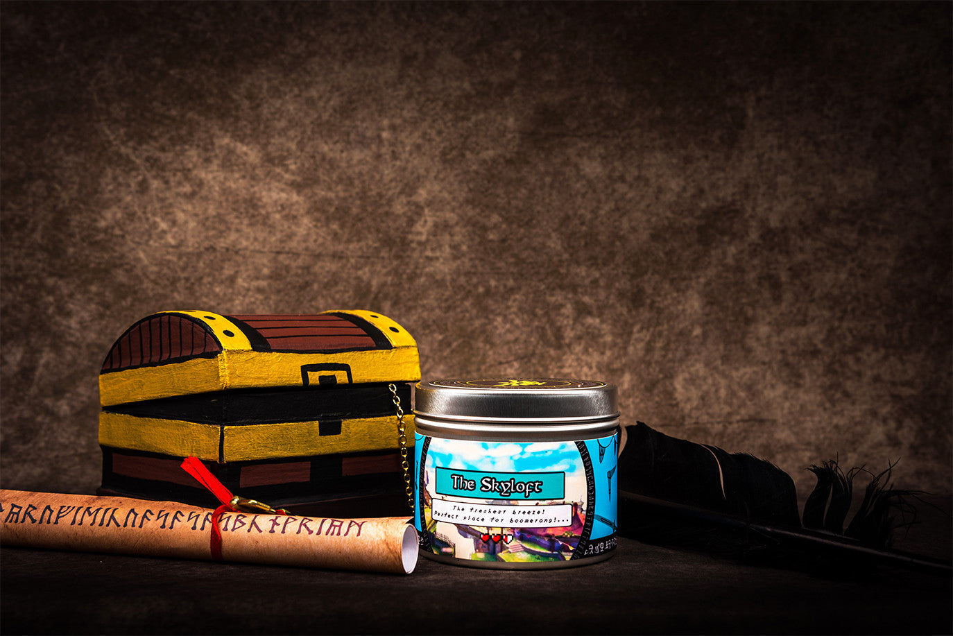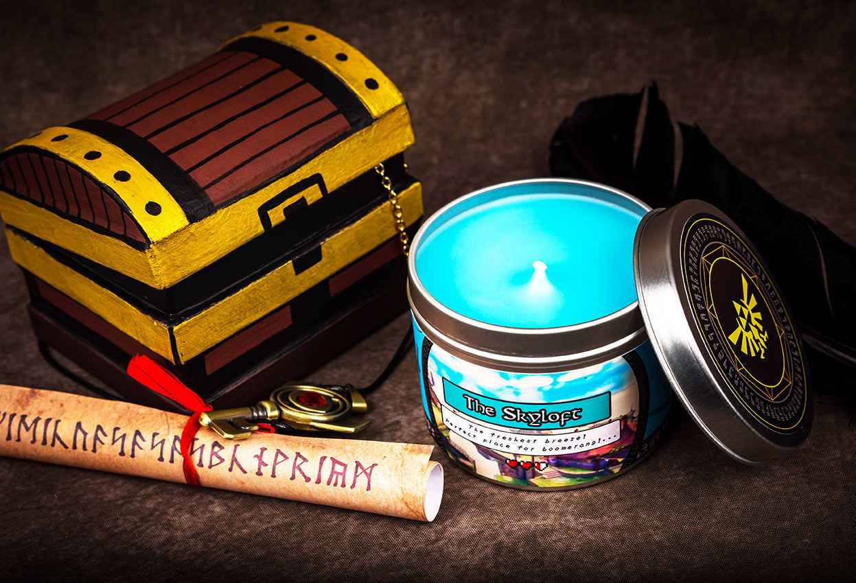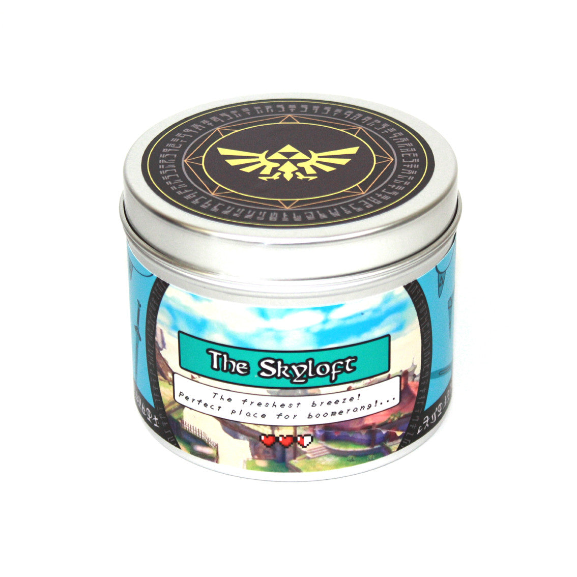 Happy Piranha's Skyloft scented candle whisks up a fresh breeze to teleport you to this famous Zelda location.''Skyloft consists of several scattered landmasses suspended in the sky above Hyrule, sent into the sky by goddess Hylia, It is the birthplace of both Link and Zelda and home to the Knights Academy''.