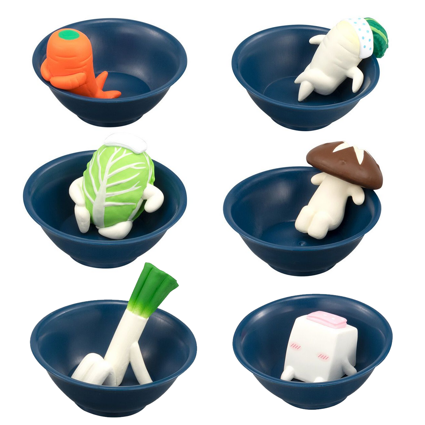These hilarious gachapon figures feature 6 different hotpot ingredient vegetables taking a soak in their bowl.